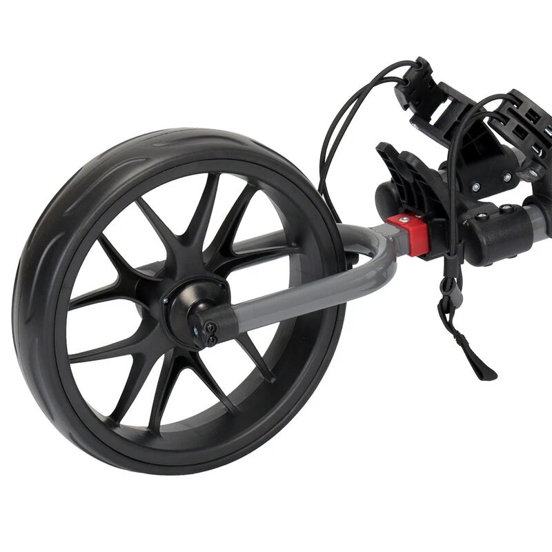The Slider 3-wheel push trolley has a sporty and sturdy construction, with upper and lower bag straps to accommodate even the largest of golf bags. It provides easy folding and includes the umbrella attachment point, scorecard and bottle holder, unlike most leading brands. Other features include a foot parking brake, valuables compartment, and has a removable front wheel to fit in tighter storage spaces.